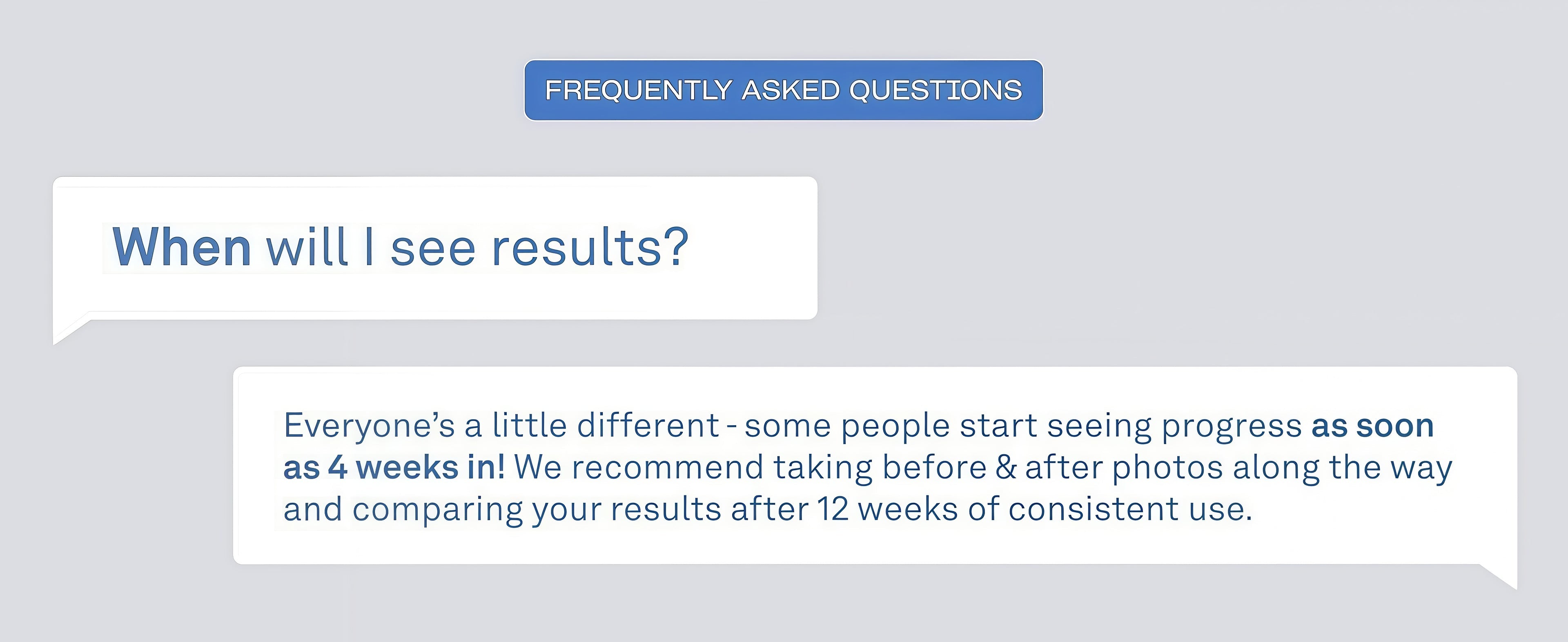 Everyone’s a little different - some people start seeing progress as soon as 4 weeks in! We recommend taking before & after photos along the way and comparing your results after 12 weeks of consistent use.